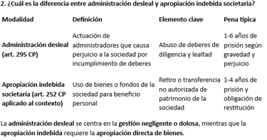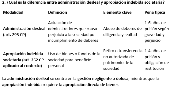 Actuaciones de administradores que causan un perjuicio patrimonial a la sociedad o a terceros por incumplimiento de deberes de diligencia y lealtad.Apropiación indebida societaria (art. 252 CP, aplicable al contexto empresarial)