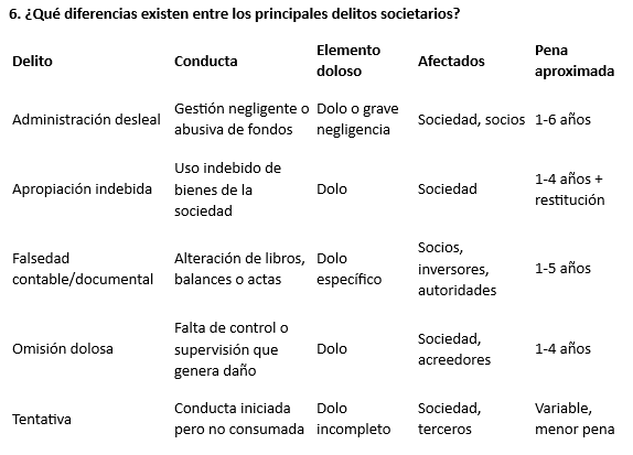 Incluyen: administración desleal, apropiación indebida de bienes de la sociedad, falsedad contable y documental, y otras conductas gravemente perjudiciales para la sociedad.